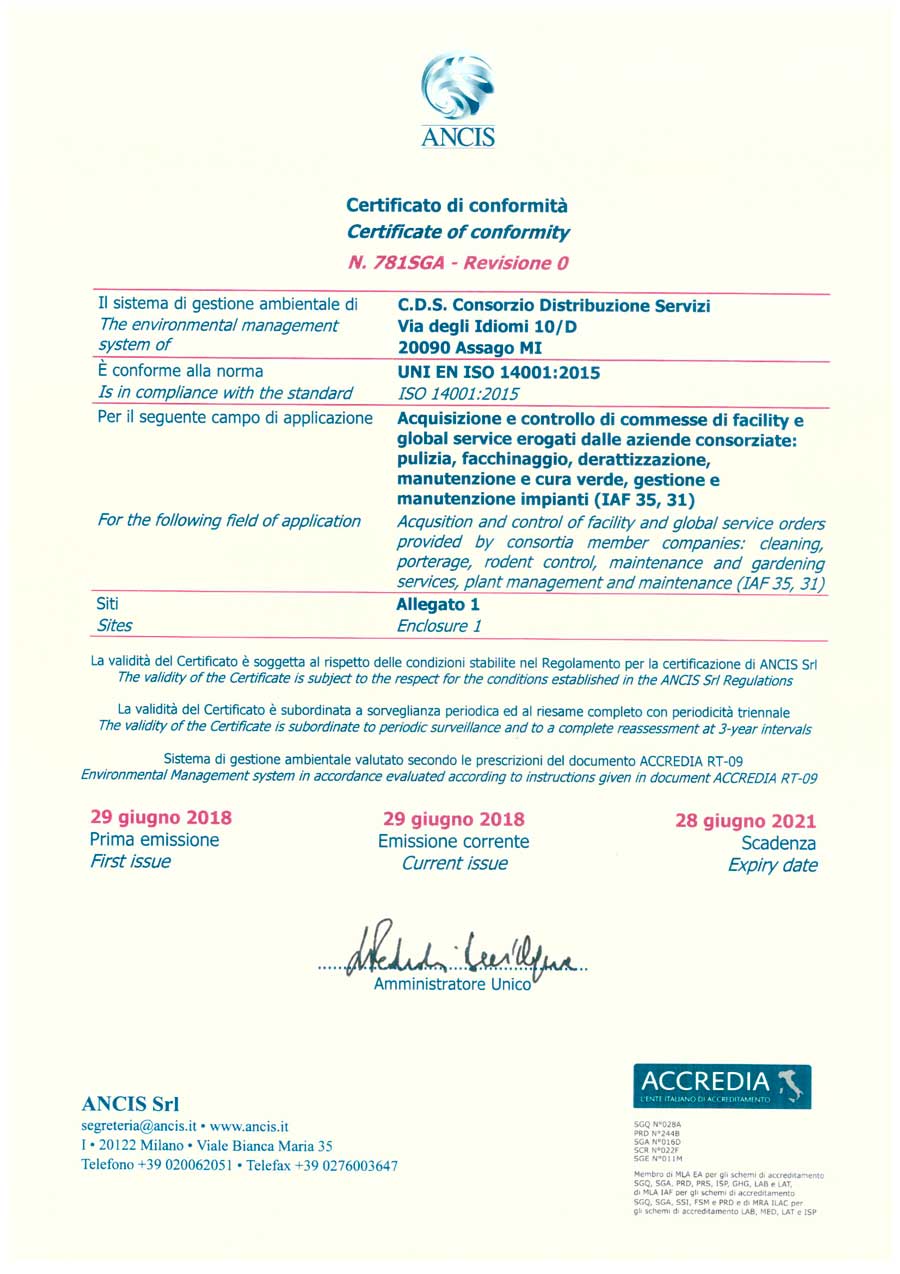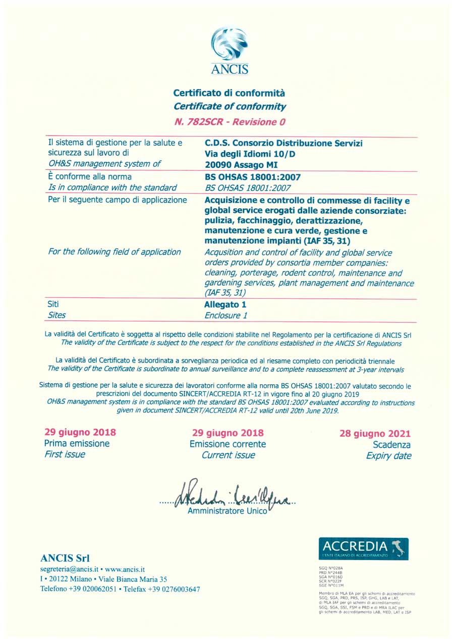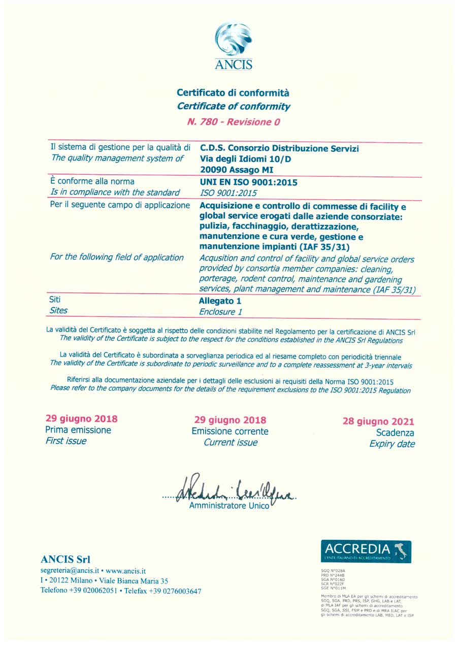 CDS - Consorzio Distribuzione Servizi ha ottenuto i seguenti Certificati di ConformitÃ